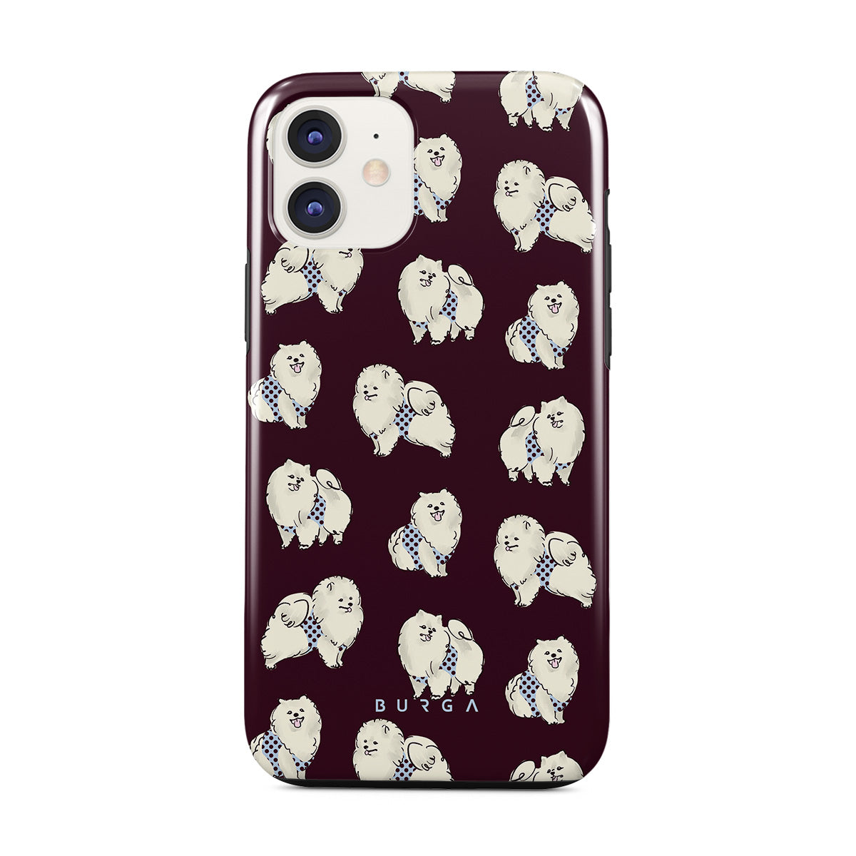 Kenmerken van dit design: witte pluizige honden op een diepe bordeauxrode achtergrond, poedels, huisdieren.