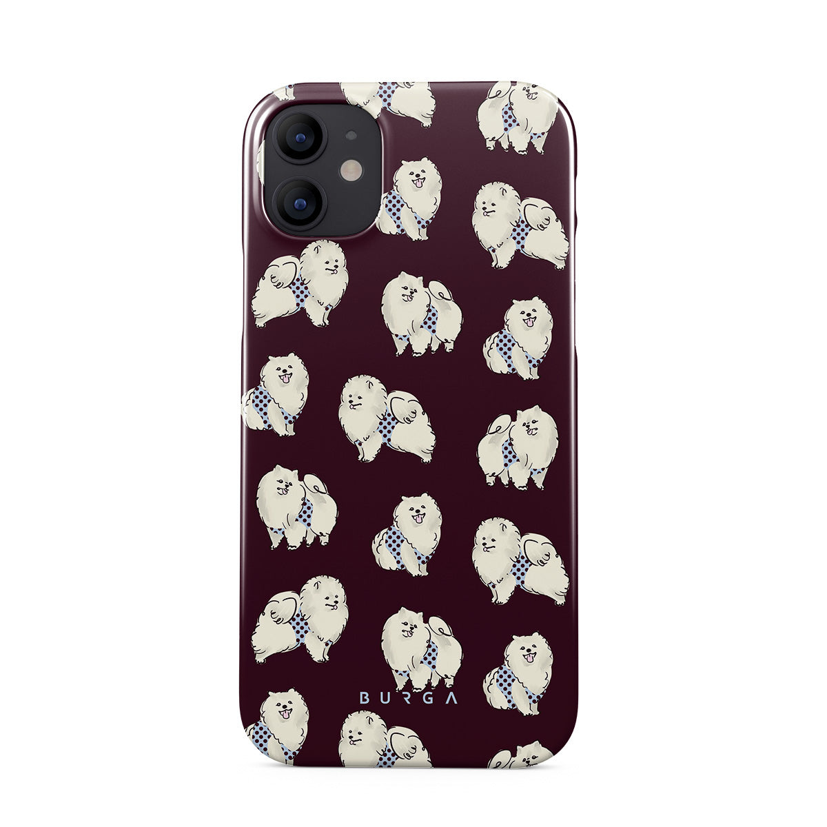 Kenmerken van dit design: witte pluizige honden op een diepe bordeauxrode achtergrond, poedels, huisdieren.