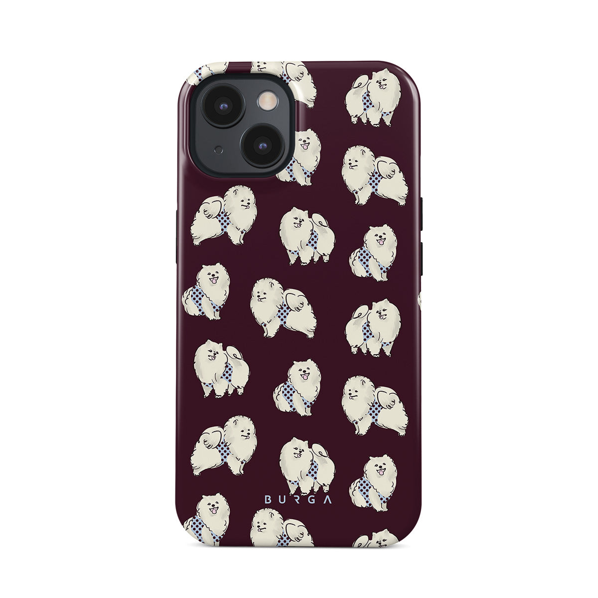 Kenmerken van dit design: witte pluizige honden op een diepe bordeauxrode achtergrond, poedels, huisdieren.