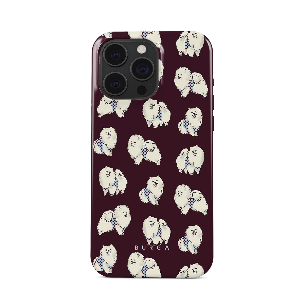 Kenmerken van dit design: witte pluizige honden op een diepe bordeauxrode achtergrond, poedels, huisdieren.
