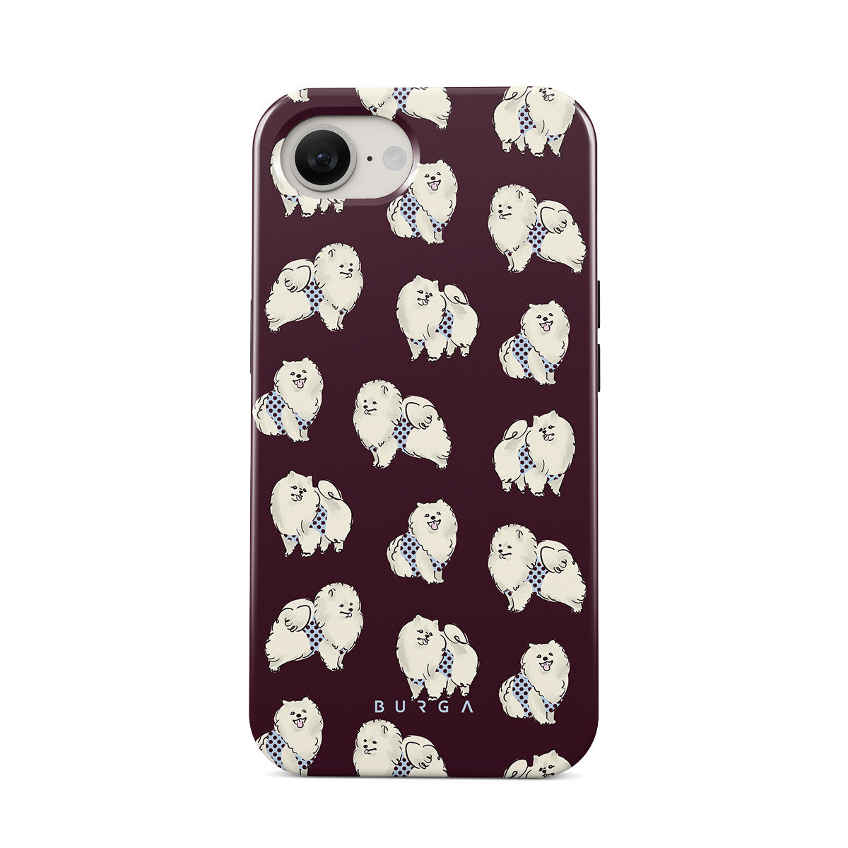 Kenmerken van dit design: witte pluizige honden op een diepe bordeauxrode achtergrond, poedels, huisdieren.