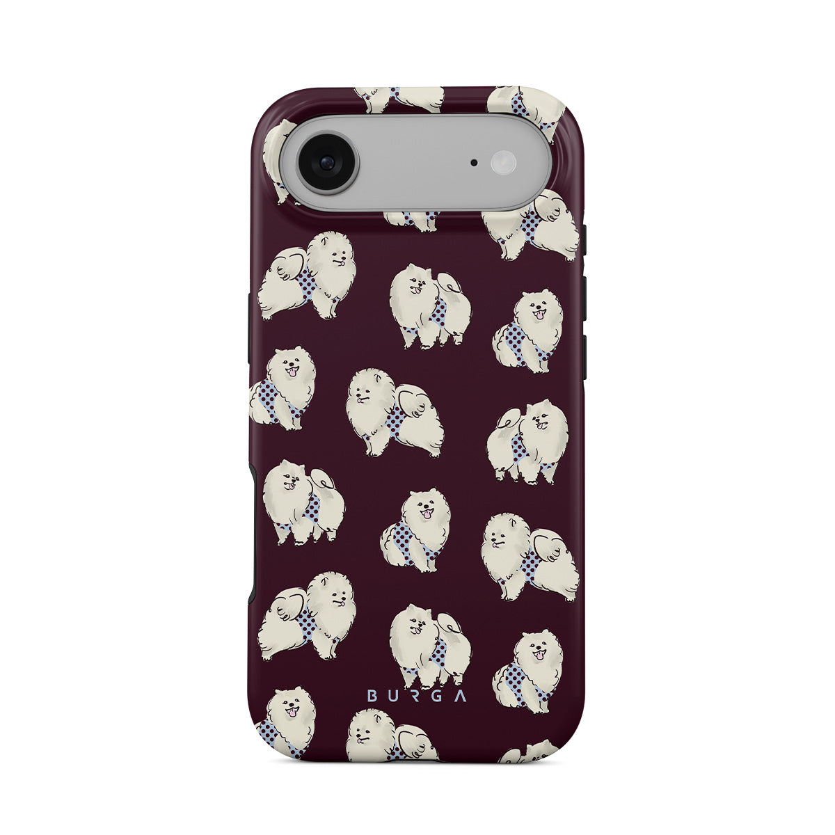 Kenmerken van dit design: witte pluizige honden op een diepe bordeauxrode achtergrond, poedels, huisdieren.