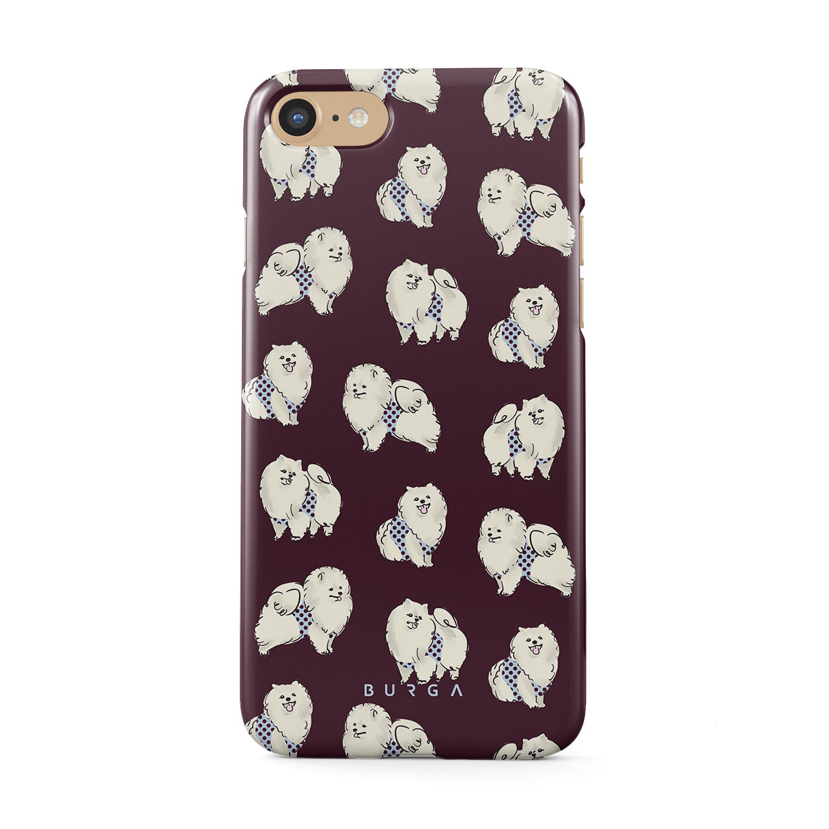 Kenmerken van dit design: witte pluizige honden op een diepe bordeauxrode achtergrond, poedels, huisdieren.