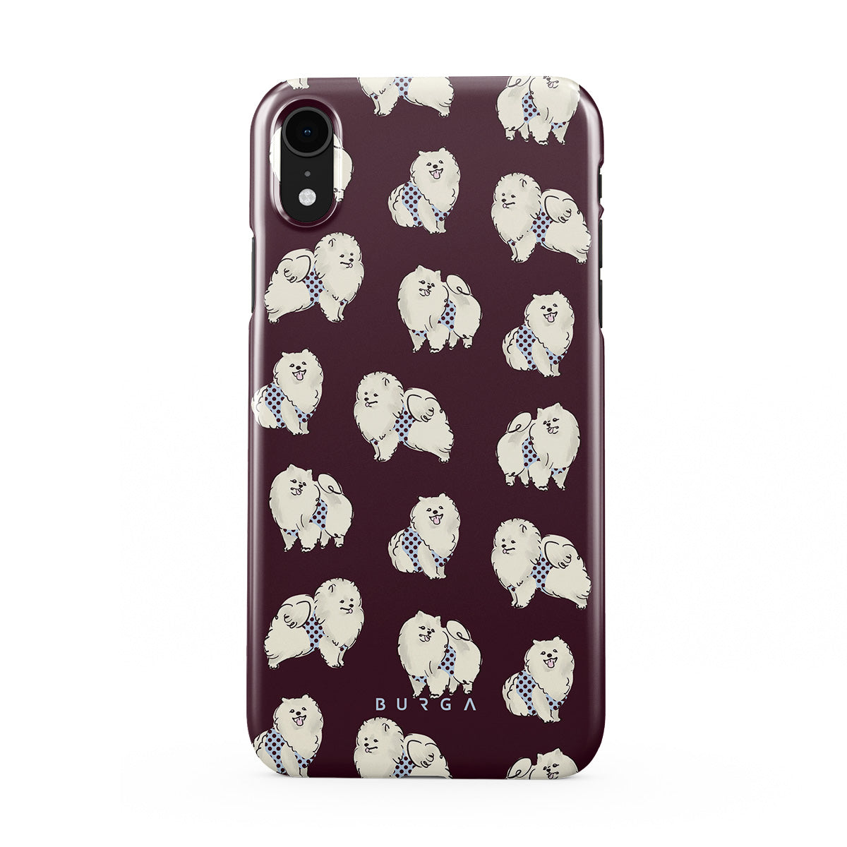 Kenmerken van dit design: witte pluizige honden op een diepe bordeauxrode achtergrond, poedels, huisdieren.