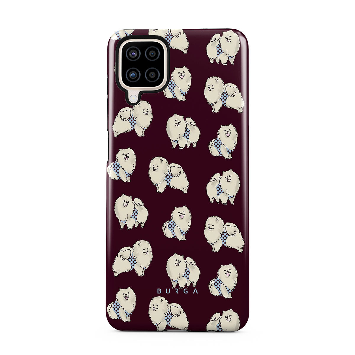 Kenmerken van dit design: witte pluizige honden op een diepe bordeauxrode achtergrond, poedels, huisdieren.