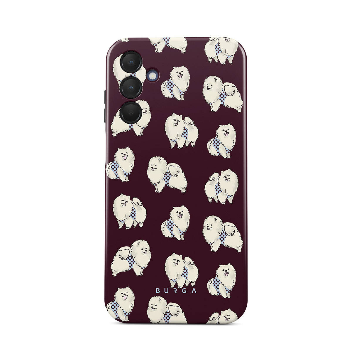 Kenmerken van dit design: witte pluizige honden op een diepe bordeauxrode achtergrond, poedels, huisdieren.