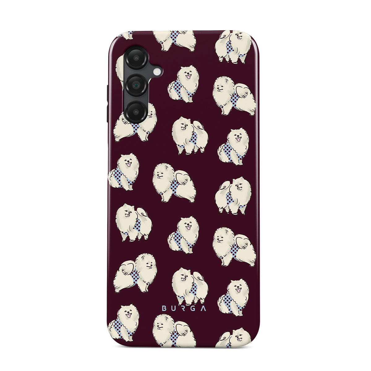 Kenmerken van dit design: witte pluizige honden op een diepe bordeauxrode achtergrond, poedels, huisdieren.