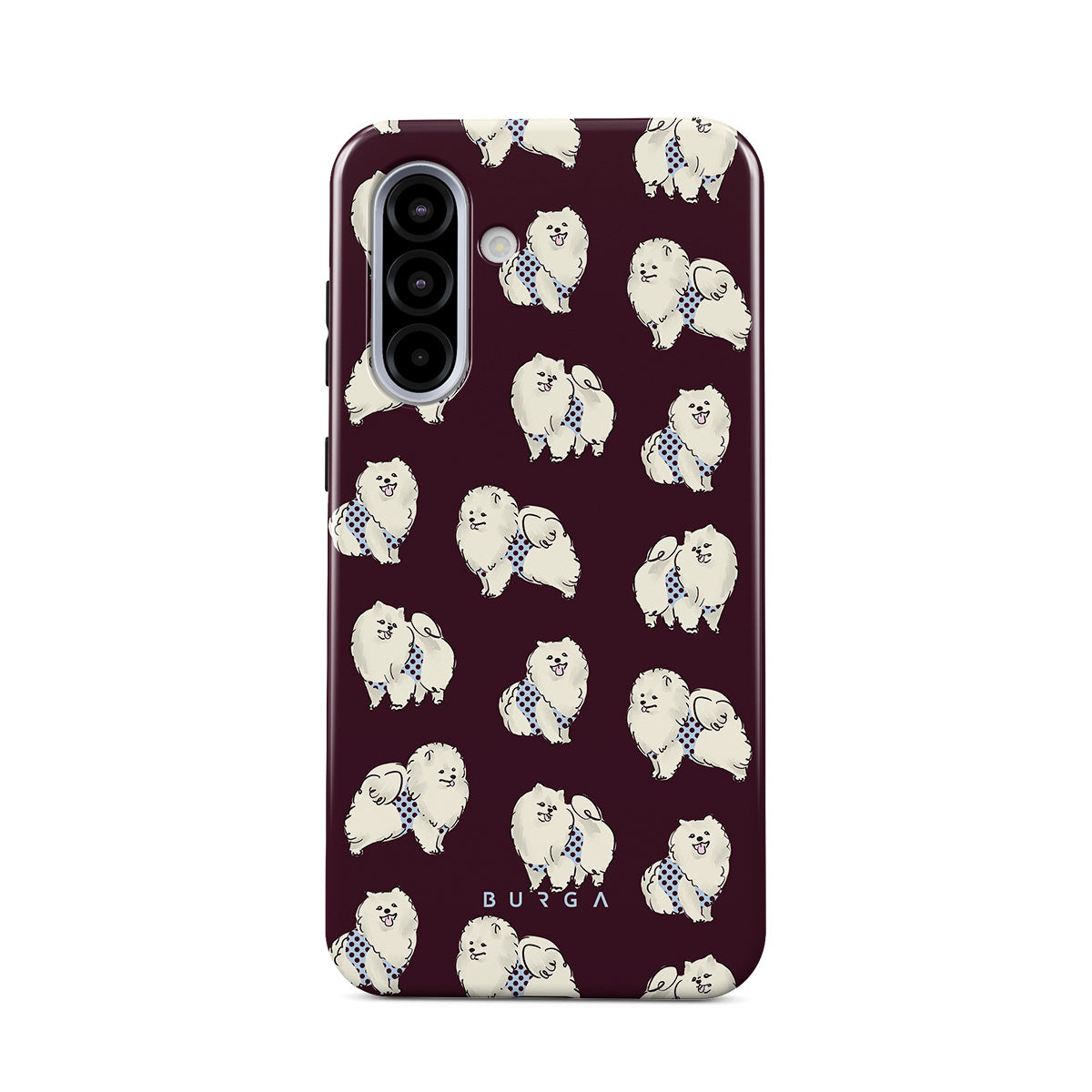 Kenmerken van dit design: witte pluizige honden op een diepe bordeauxrode achtergrond, poedels, huisdieren.