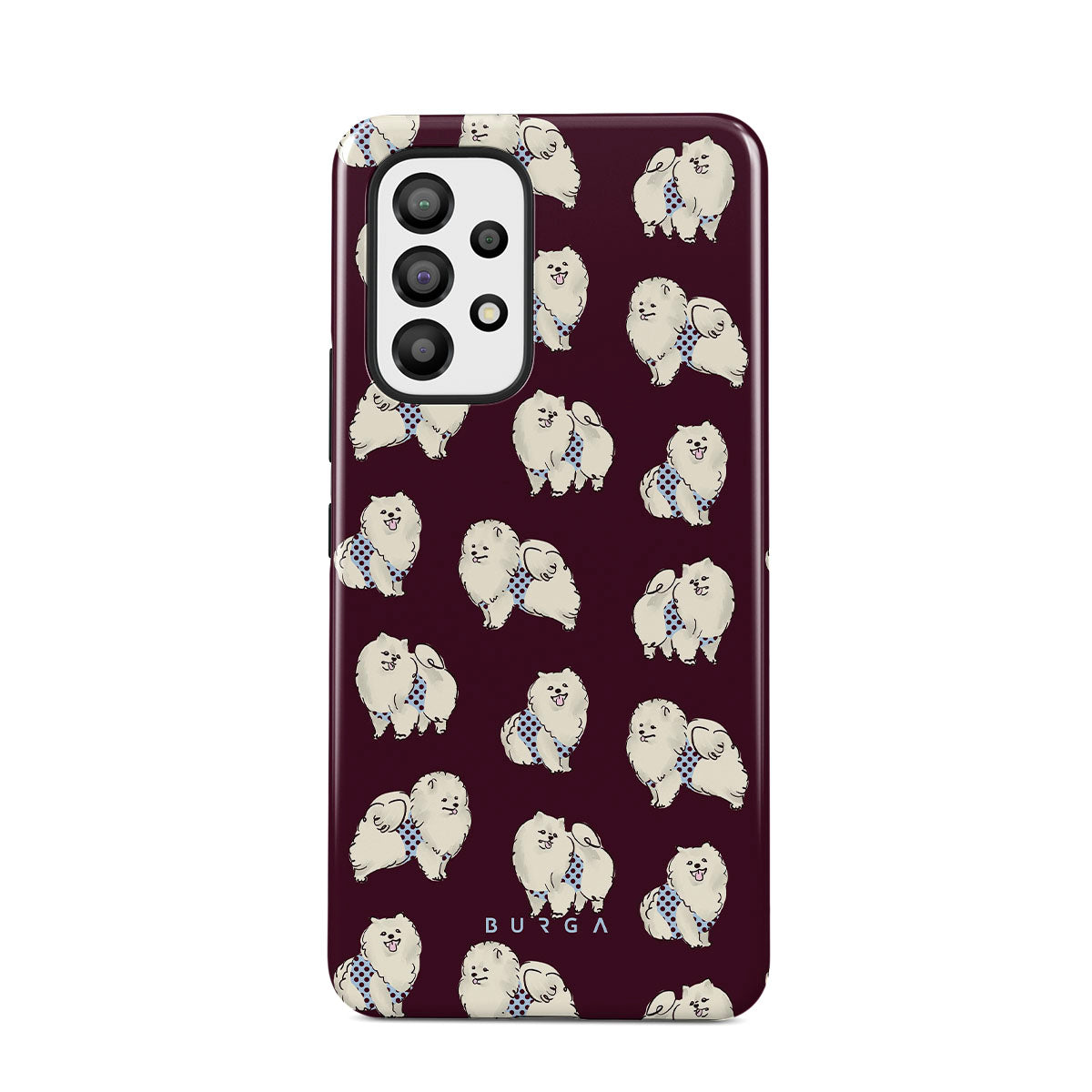 Kenmerken van dit design: witte pluizige honden op een diepe bordeauxrode achtergrond, poedels, huisdieren.