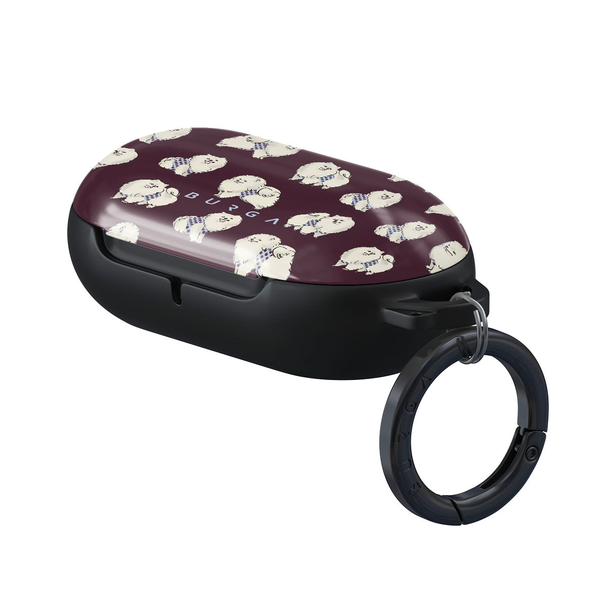 Kenmerken van dit design: witte pluizige honden op een diepe bordeauxrode achtergrond, poedels, huisdieren.