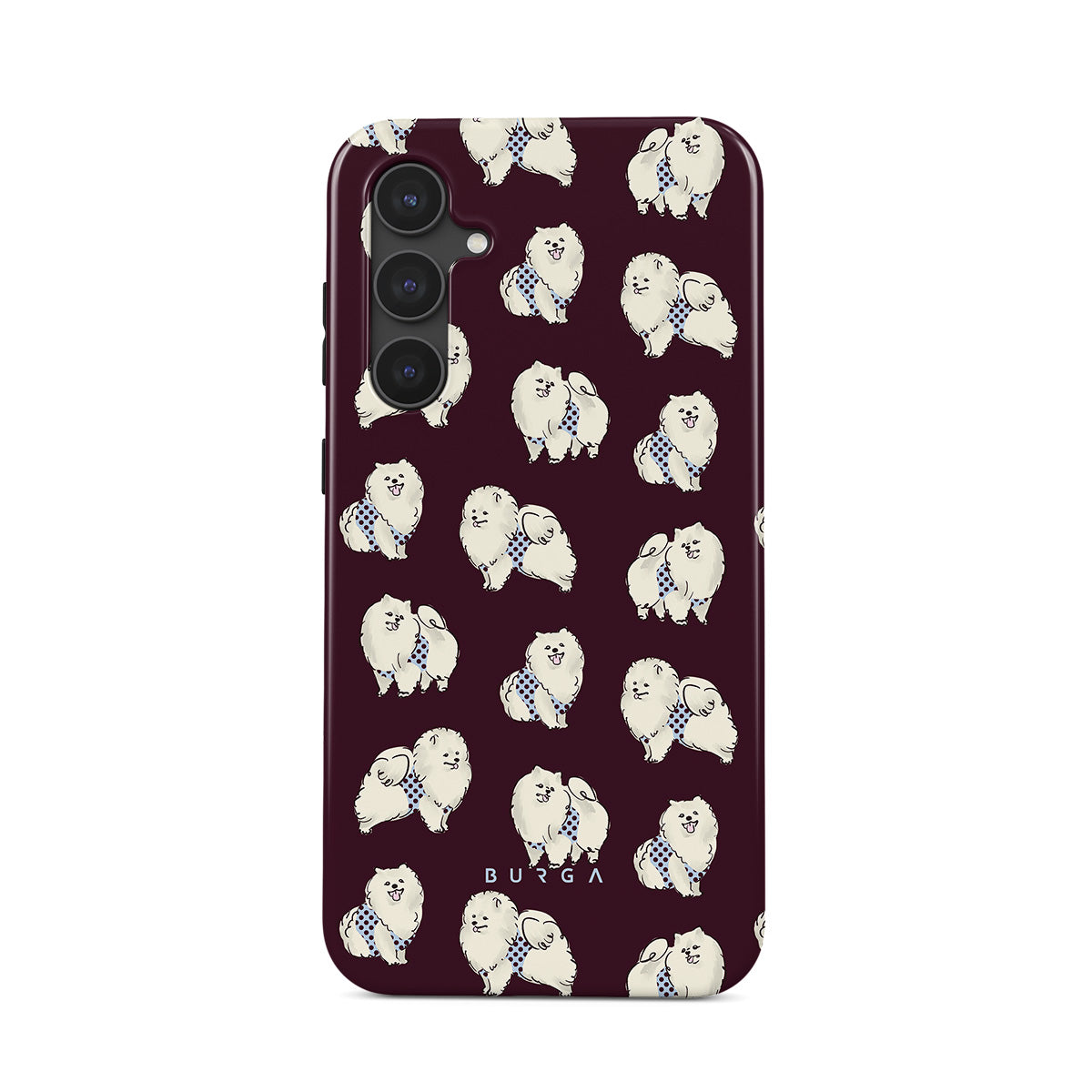 Kenmerken van dit design: witte pluizige honden op een diepe bordeauxrode achtergrond, poedels, huisdieren.