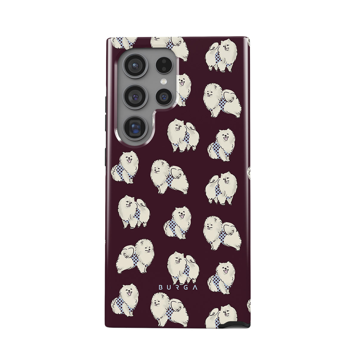 Kenmerken van dit design: witte pluizige honden op een diepe bordeauxrode achtergrond, poedels, huisdieren.