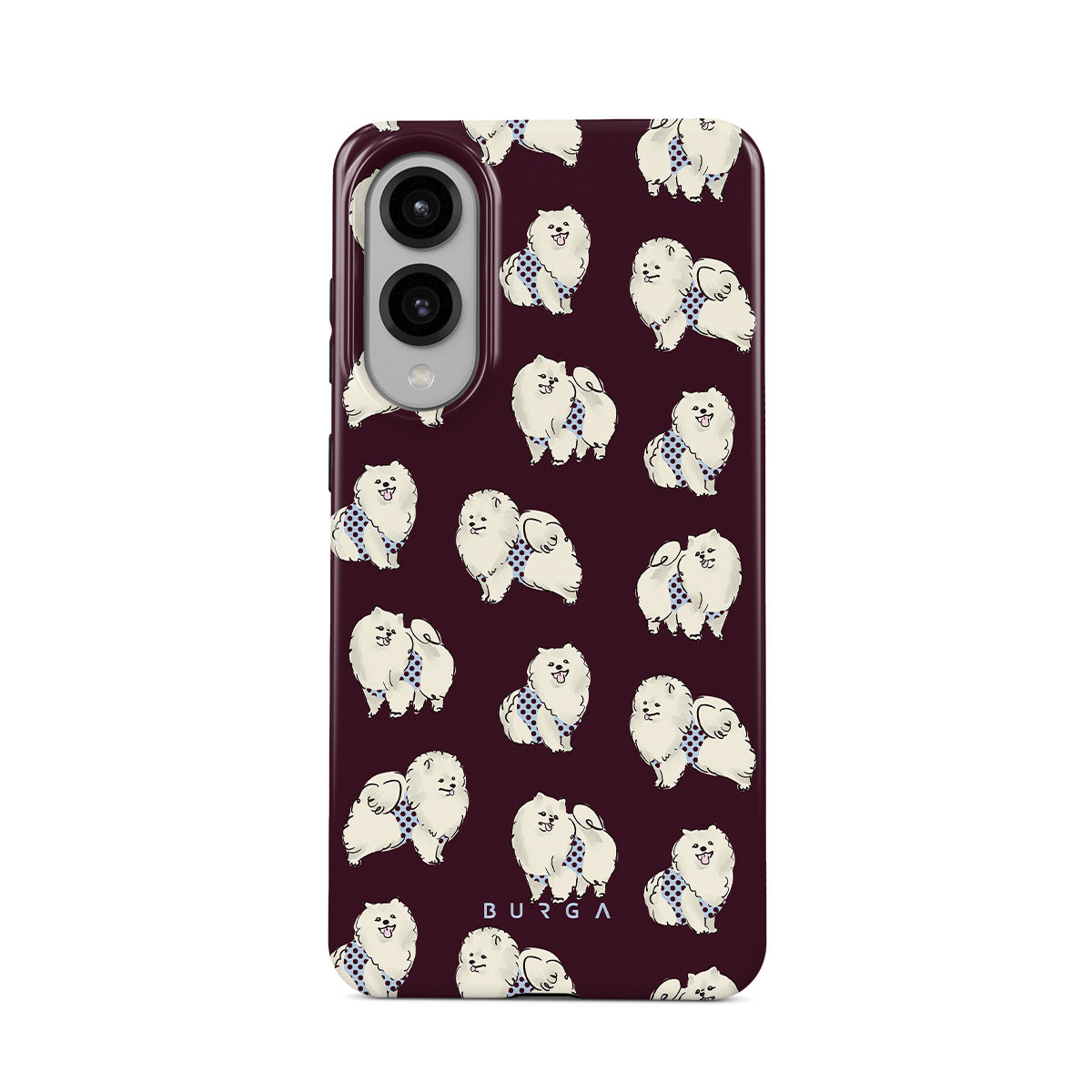 Kenmerken van dit design: witte pluizige honden op een diepe bordeauxrode achtergrond, poedels, huisdieren.
