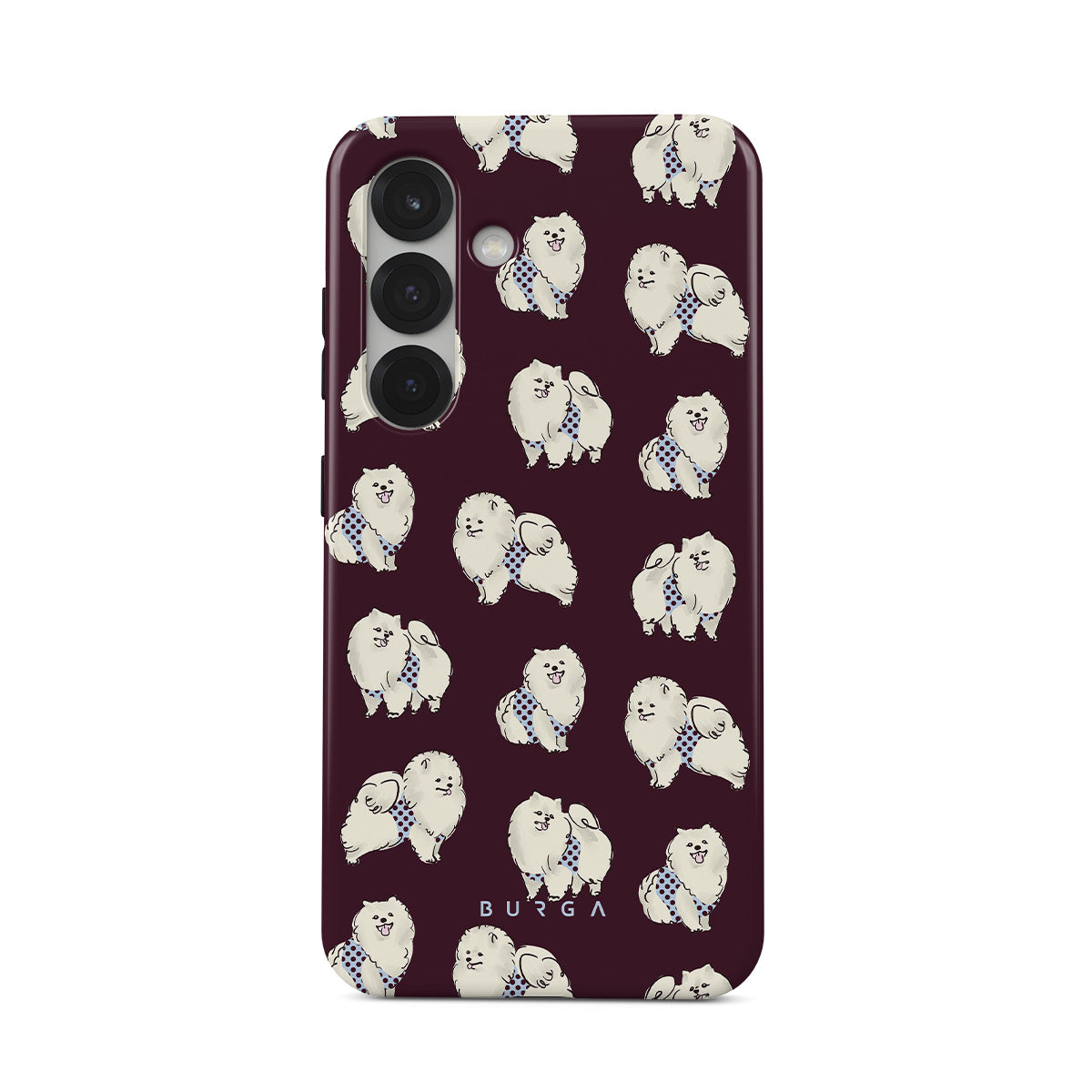 Kenmerken van dit design: witte pluizige honden op een diepe bordeauxrode achtergrond, poedels, huisdieren.