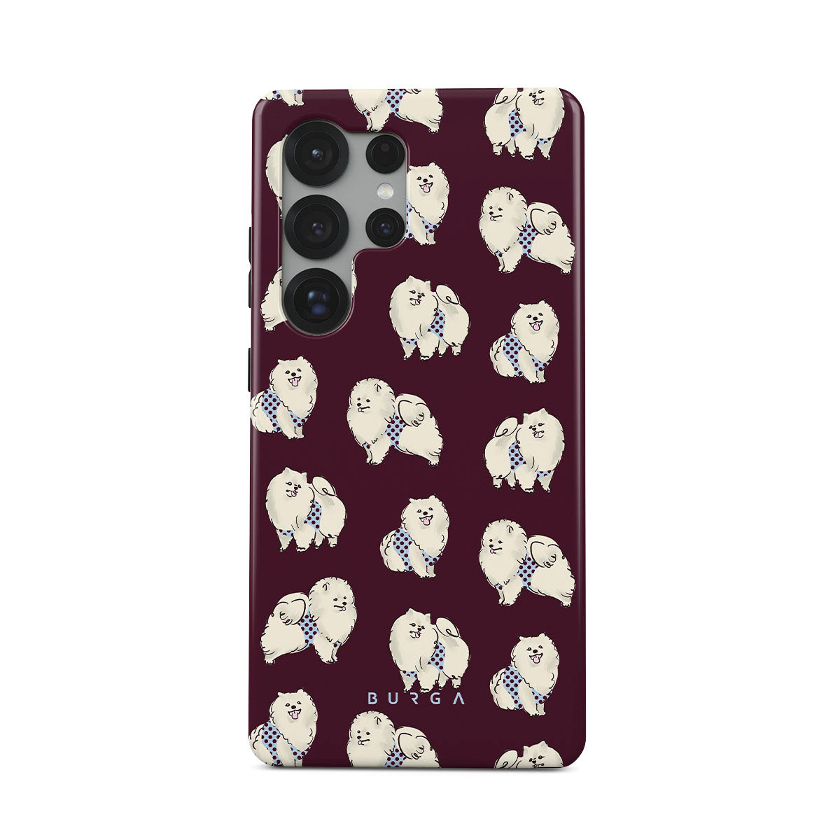 Kenmerken van dit design: witte pluizige honden op een diepe bordeauxrode achtergrond, poedels, huisdieren.