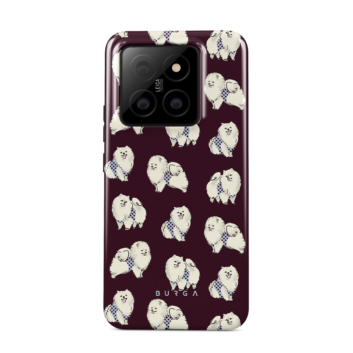 Kenmerken van dit design: witte pluizige honden op een diepe bordeauxrode achtergrond, poedels, huisdieren.