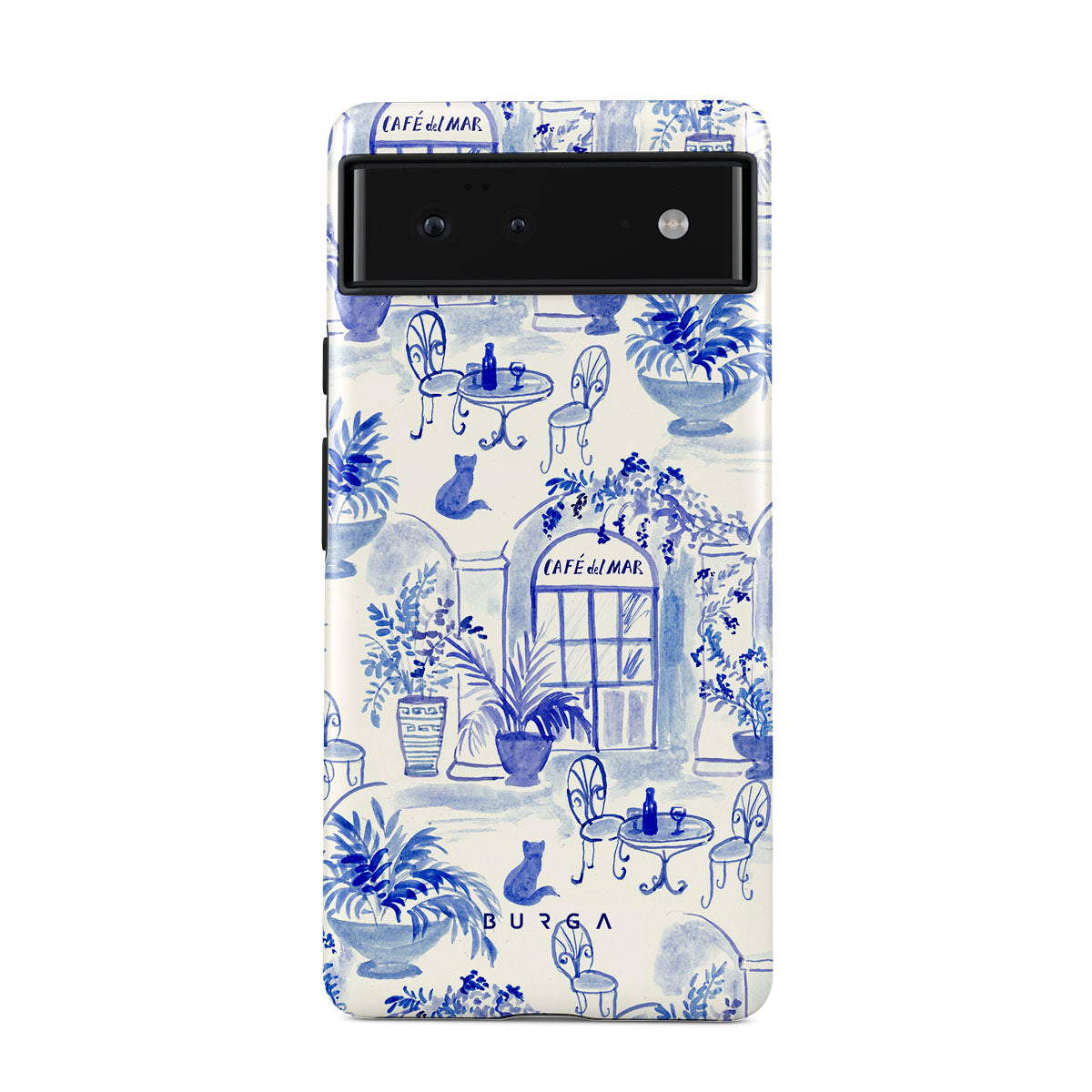 Kenmerken van dit design: Zachte blauwtinten, kustmotieven, café-elementen, minimalistische stijl, retro patronen, mediterrane patronen.