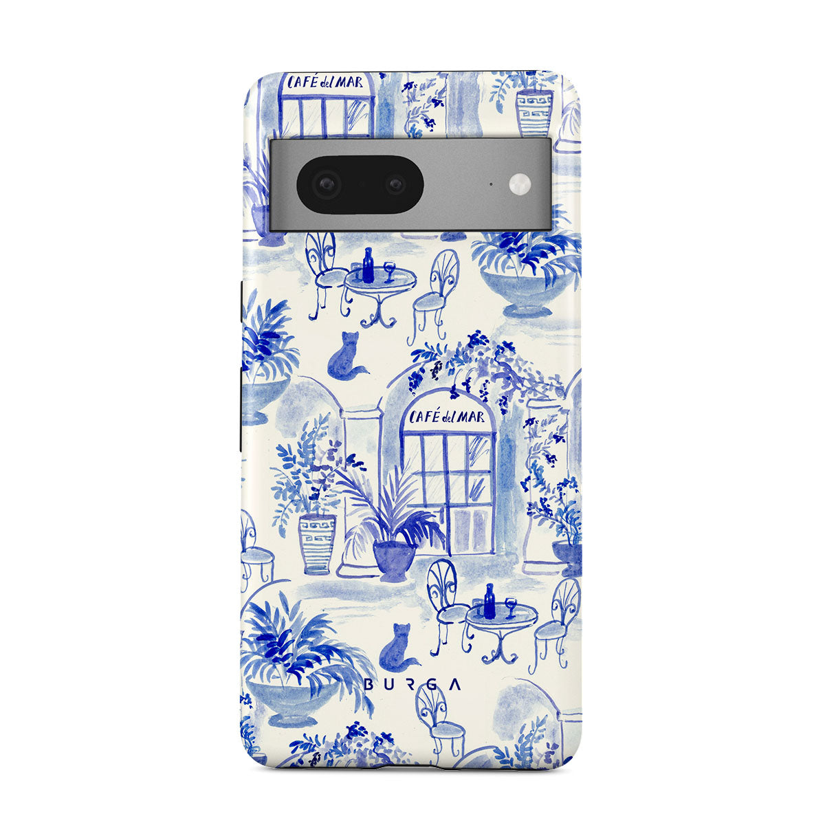 Kenmerken van dit design: Zachte blauwtinten, kustmotieven, café-elementen, minimalistische stijl, retro patronen, mediterrane patronen.