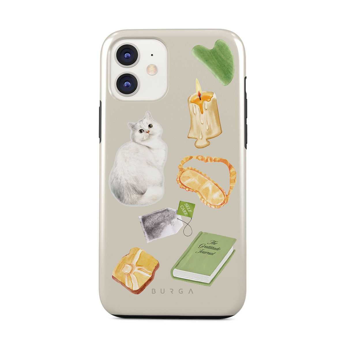 Kenmerken van dit design: witte kat, groen boek, kaars, Gua Sha-bar, slaapmasker, theezakje, gele kristal.