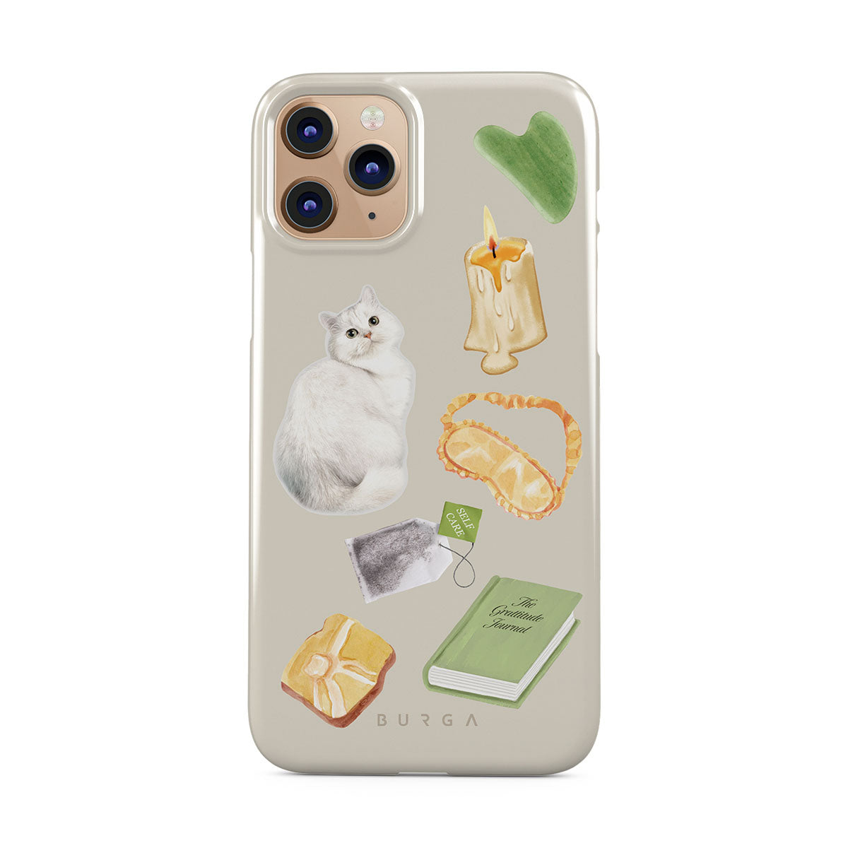 Kenmerken van dit design: witte kat, groen boek, kaars, Gua Sha-bar, slaapmasker, theezakje, gele kristal.