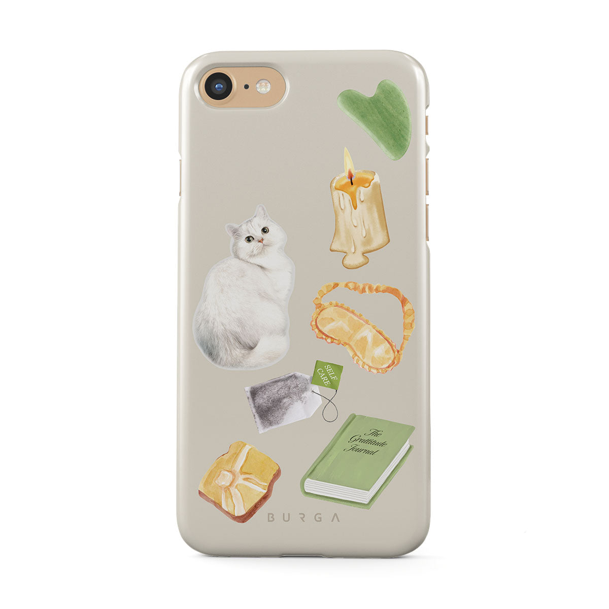 Kenmerken van dit design: witte kat, groen boek, kaars, Gua Sha-bar, slaapmasker, theezakje, gele kristal.