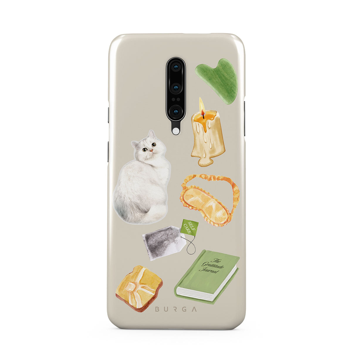 Kenmerken van dit design: witte kat, groen boek, kaars, Gua Sha-bar, slaapmasker, theezakje, gele kristal.