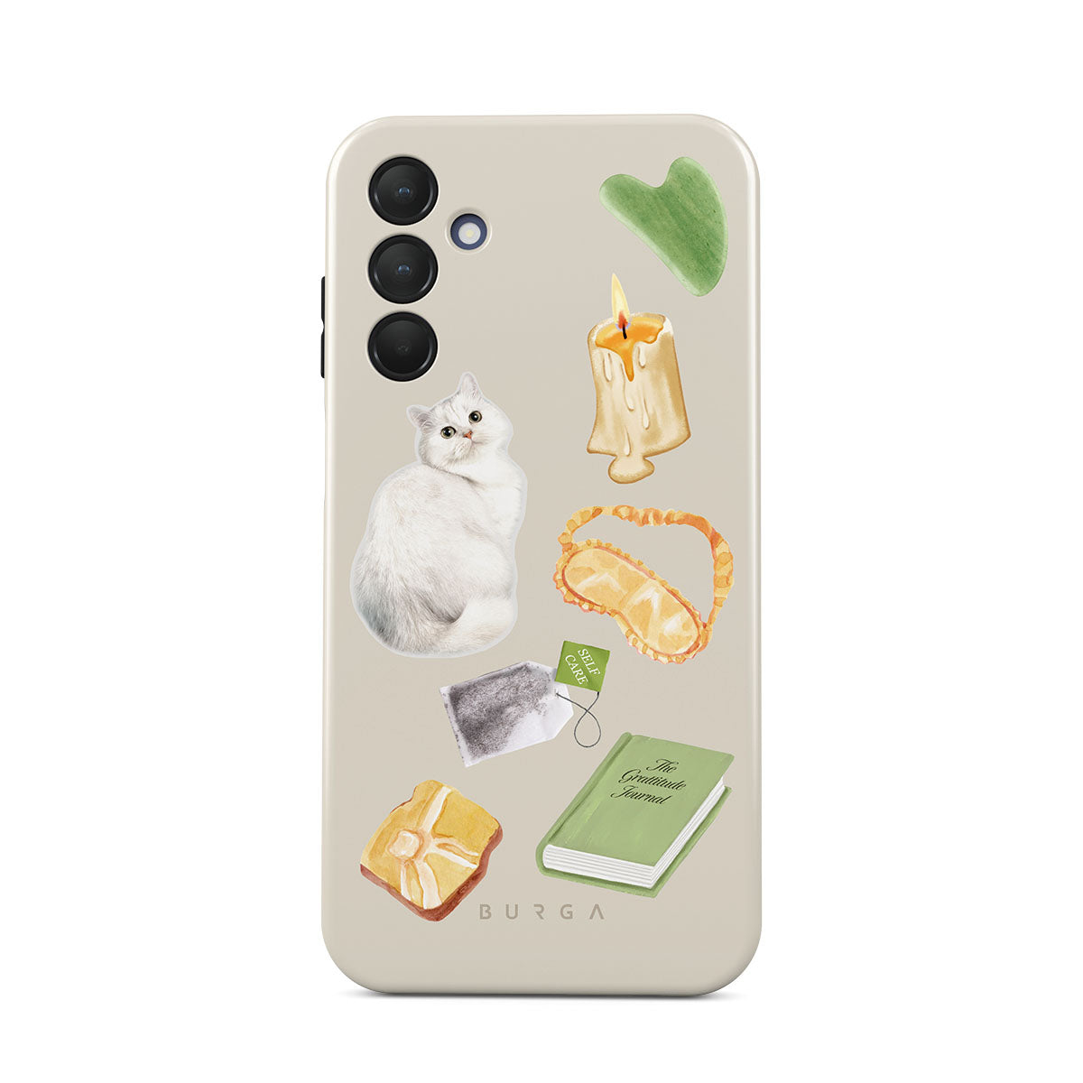 Kenmerken van dit design: witte kat, groen boek, kaars, Gua Sha-bar, slaapmasker, theezakje, gele kristal.