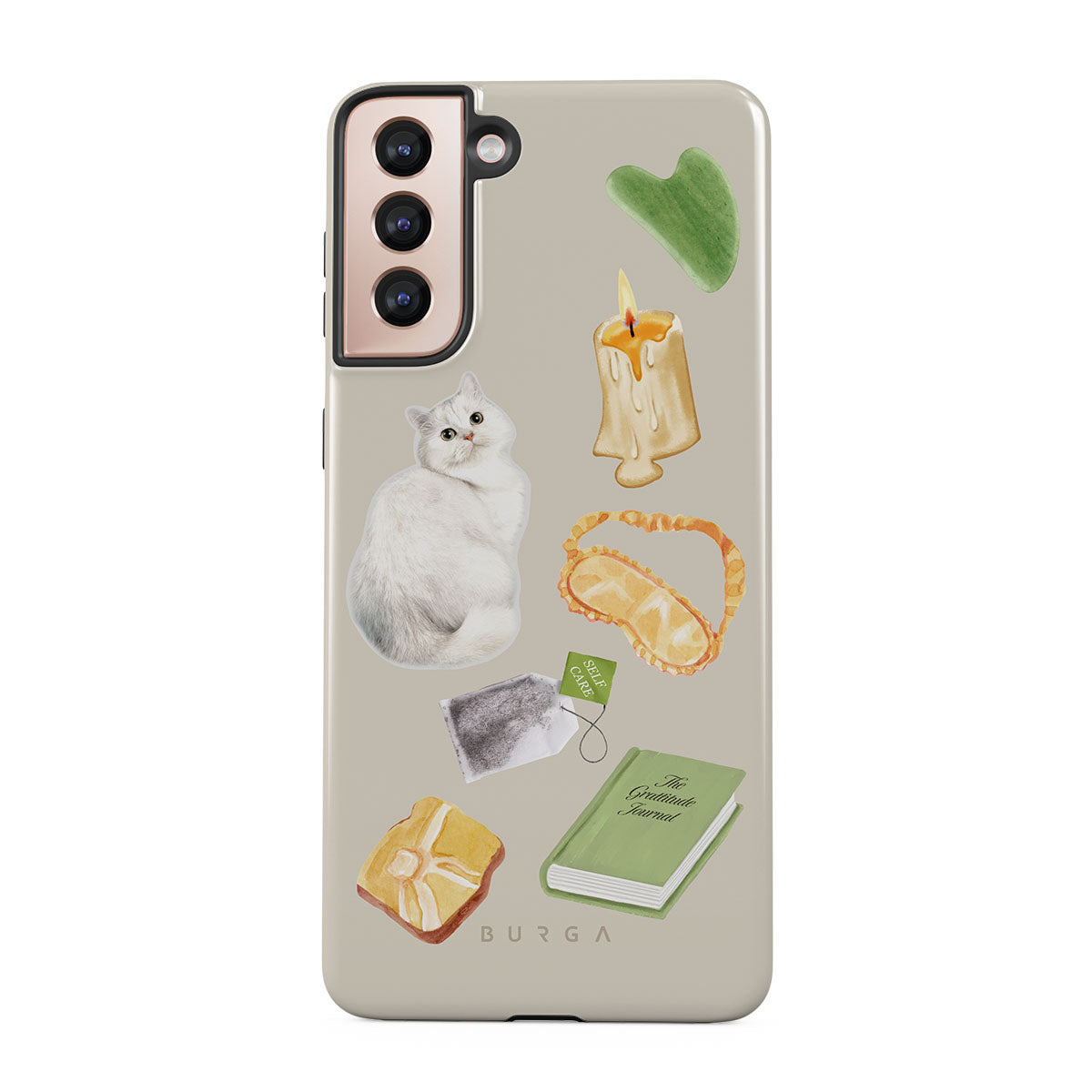 Kenmerken van dit design: witte kat, groen boek, kaars, Gua Sha-bar, slaapmasker, theezakje, gele kristal.