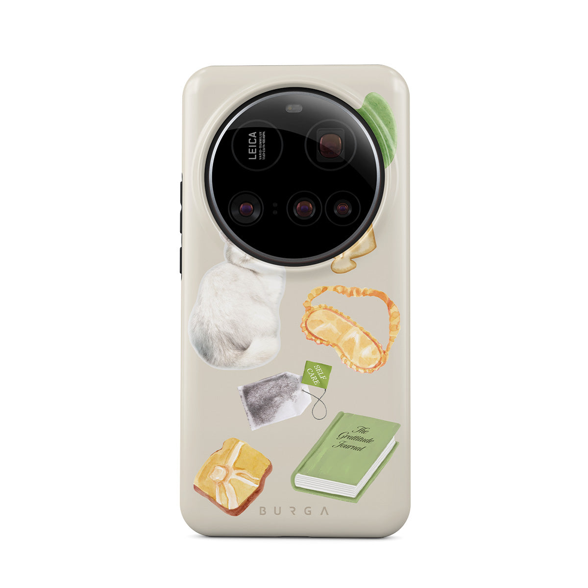 Kenmerken van dit design: witte kat, groen boek, kaars, Gua Sha-bar, slaapmasker, theezakje, gele kristal.