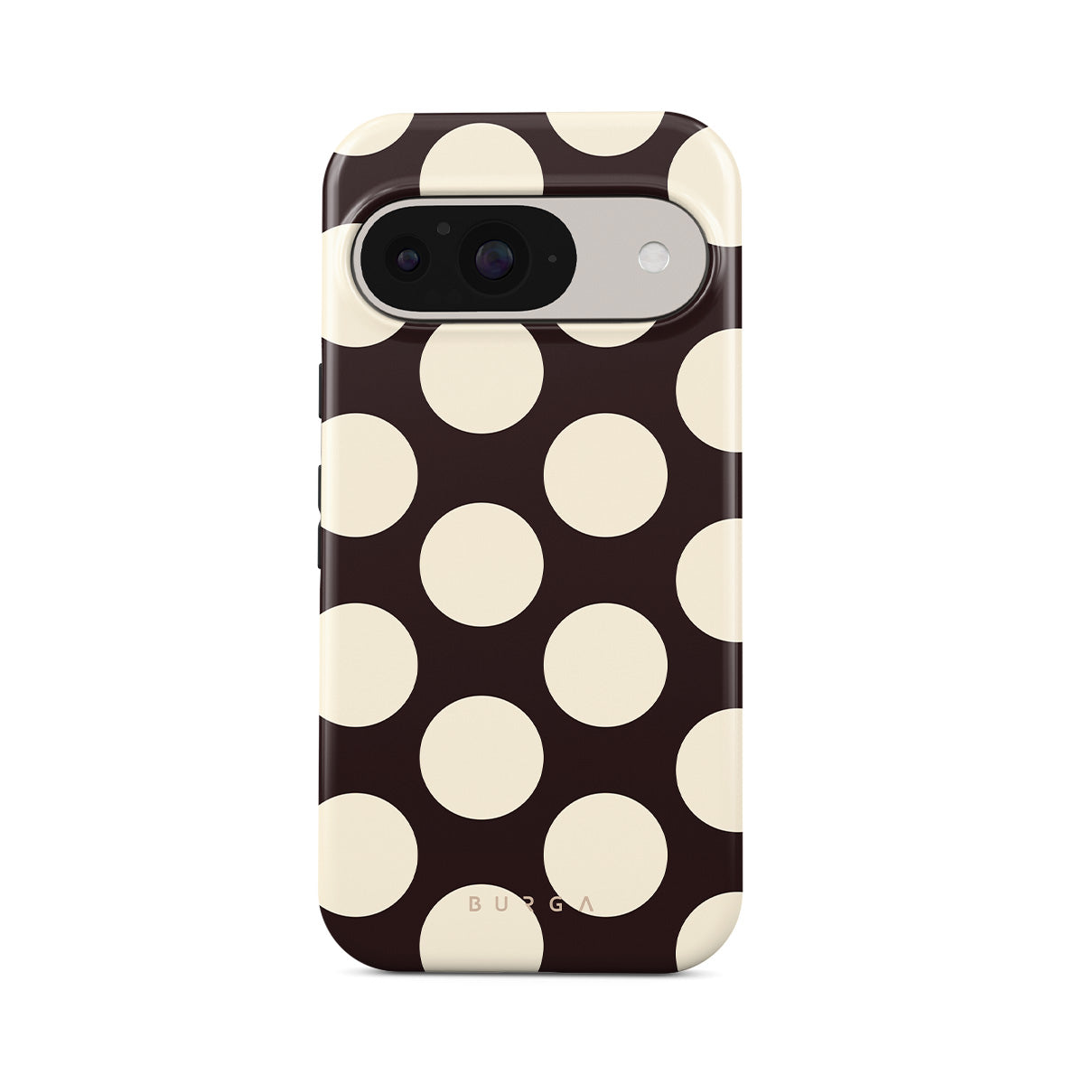 Kenmerken van dit design: grote crèmekleurige stippen op een donkere achtergrond.