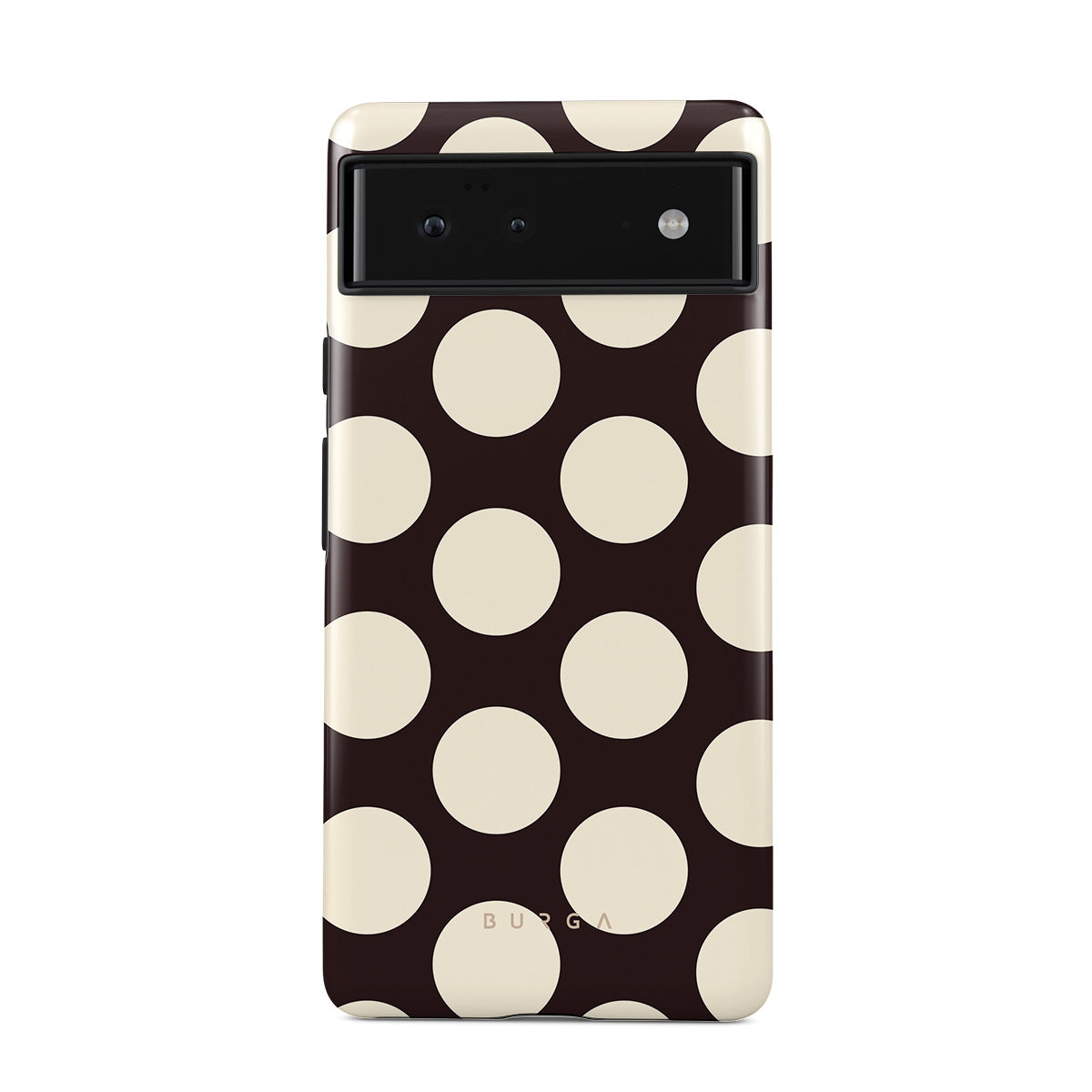 Kenmerken van dit design: grote crèmekleurige stippen op een donkere achtergrond.