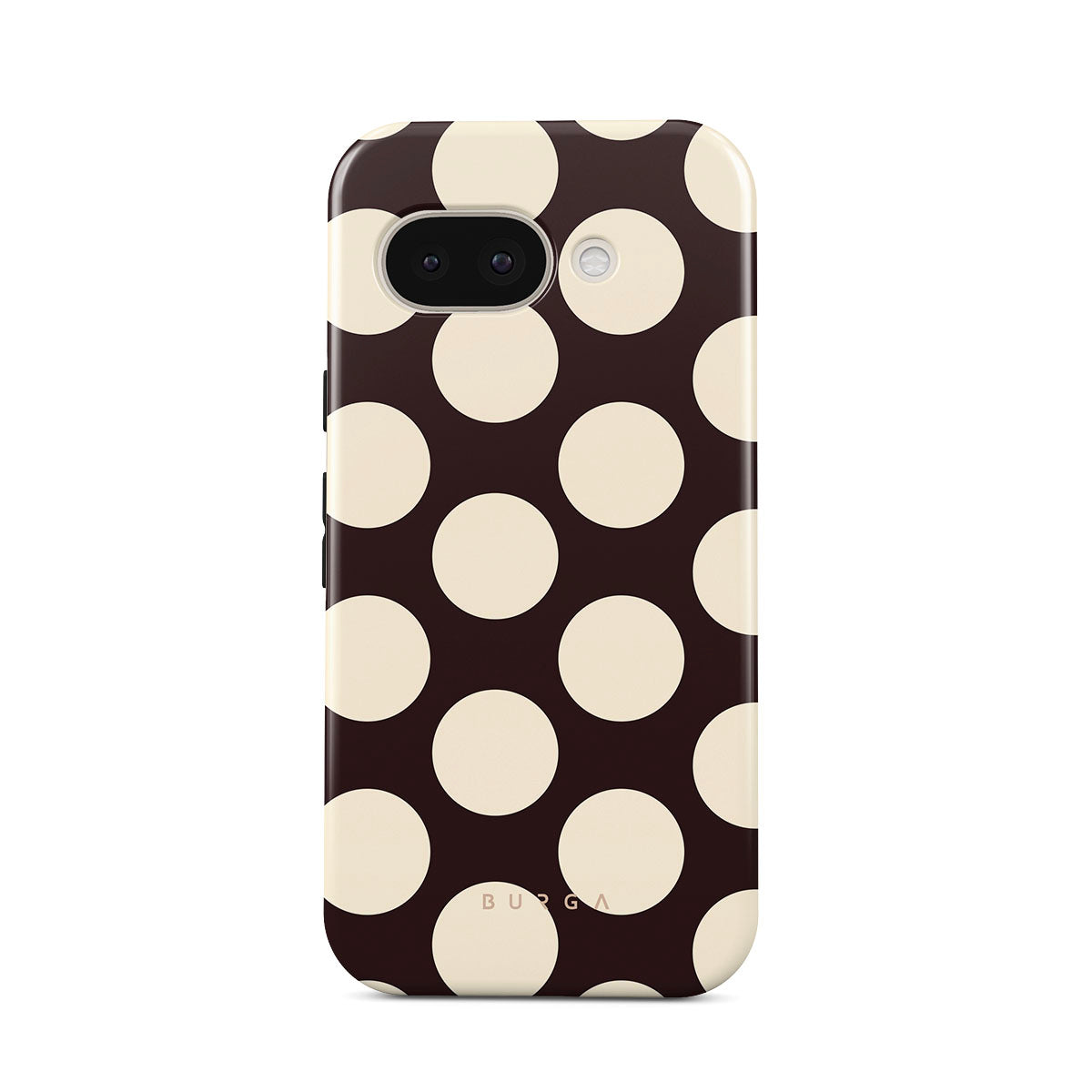 Kenmerken van dit design: grote crèmekleurige stippen op een donkere achtergrond.