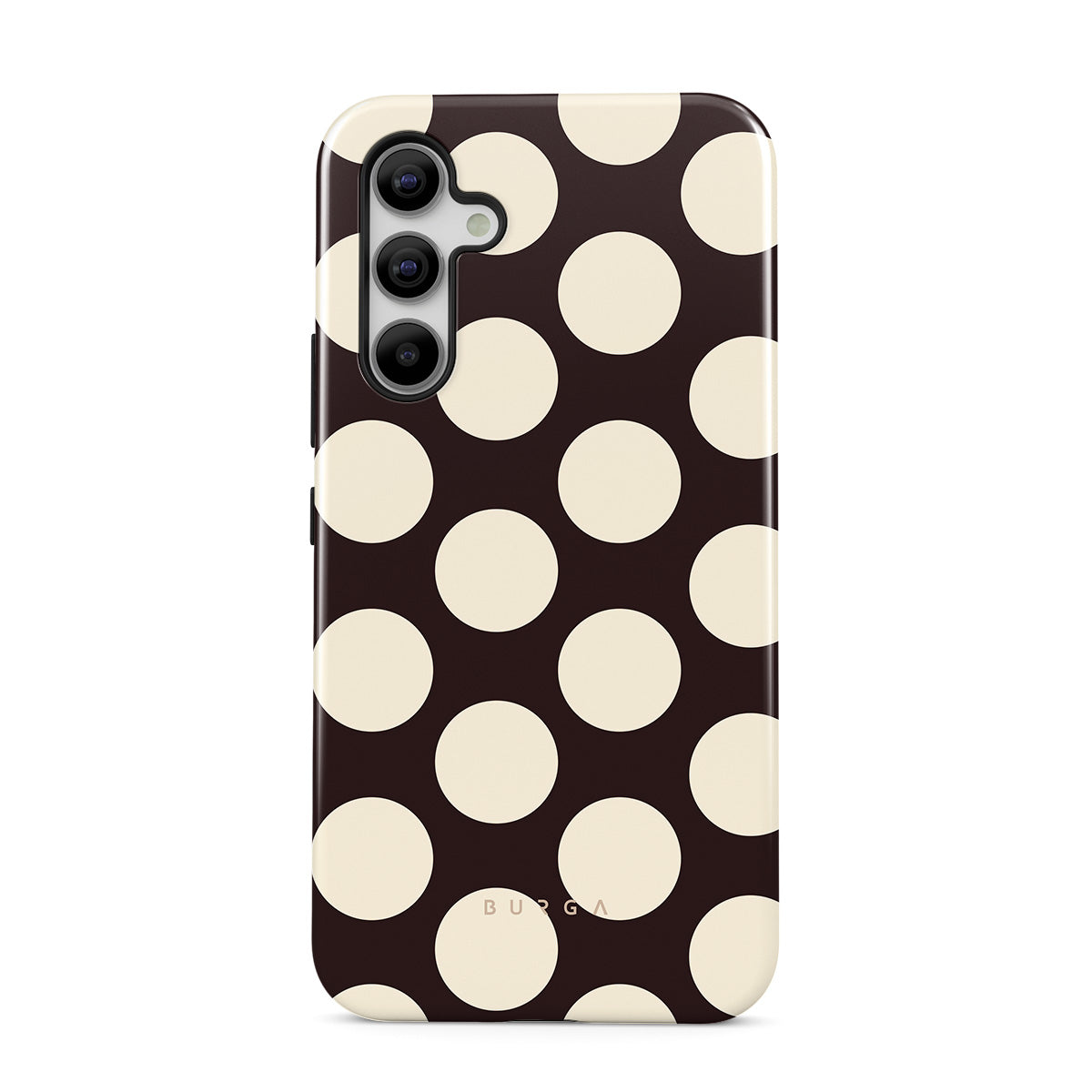 Kenmerken van dit design: grote crèmekleurige stippen op een donkere achtergrond.