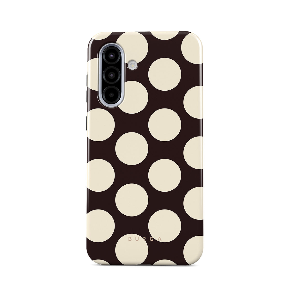 Kenmerken van dit design: grote crèmekleurige stippen op een donkere achtergrond.