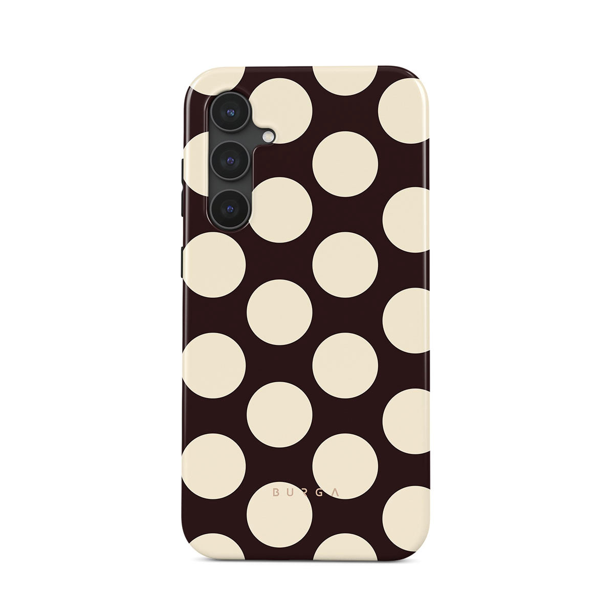 Kenmerken van dit design: grote crèmekleurige stippen op een donkere achtergrond.
