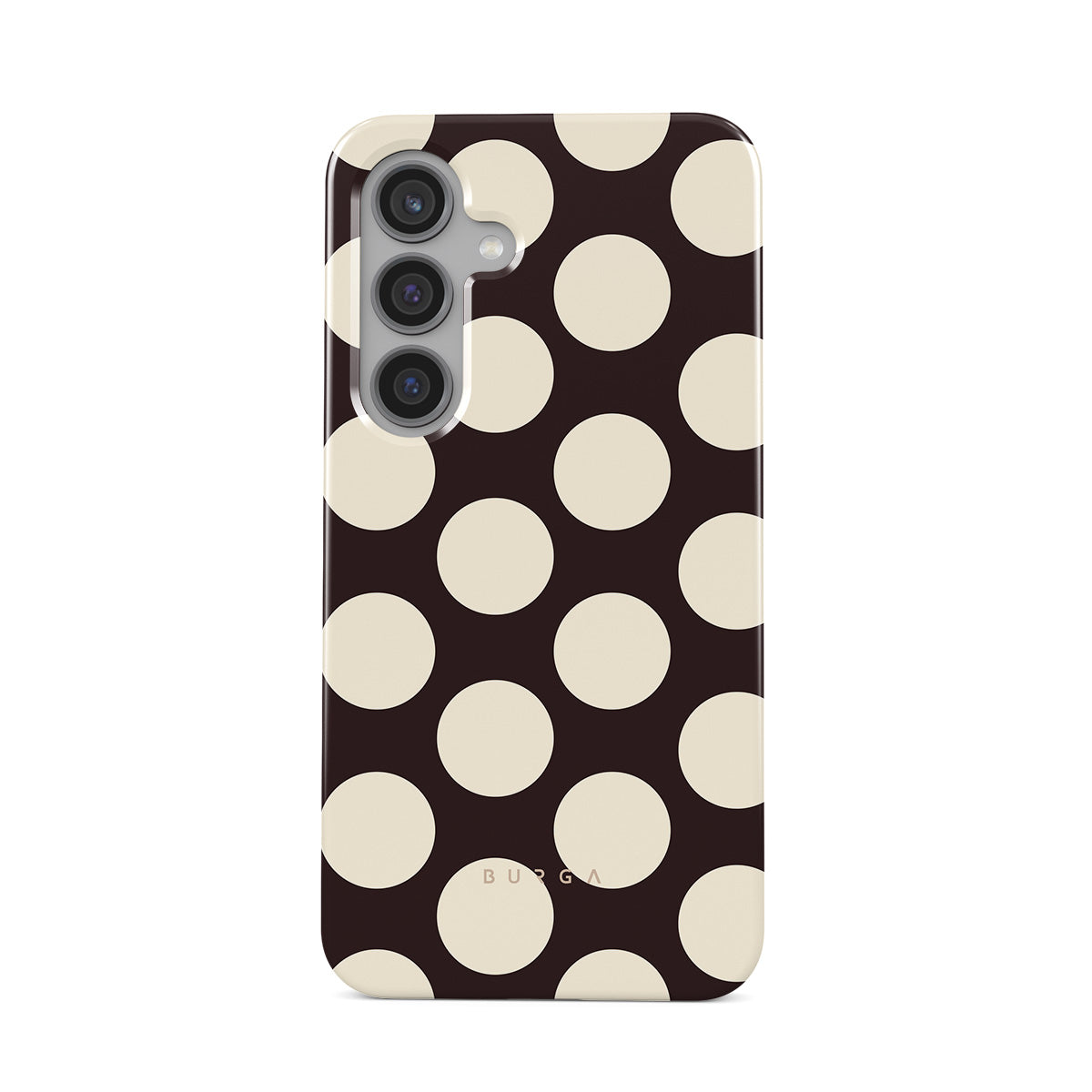 Kenmerken van dit design: grote crèmekleurige stippen op een donkere achtergrond.