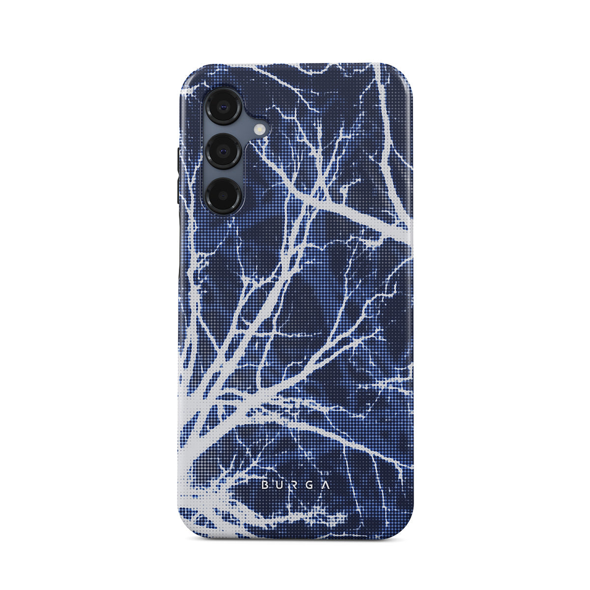 Kenmerken van dit design: blauw, boomtakken, natuur, geometrisch patroon, minimalistisch