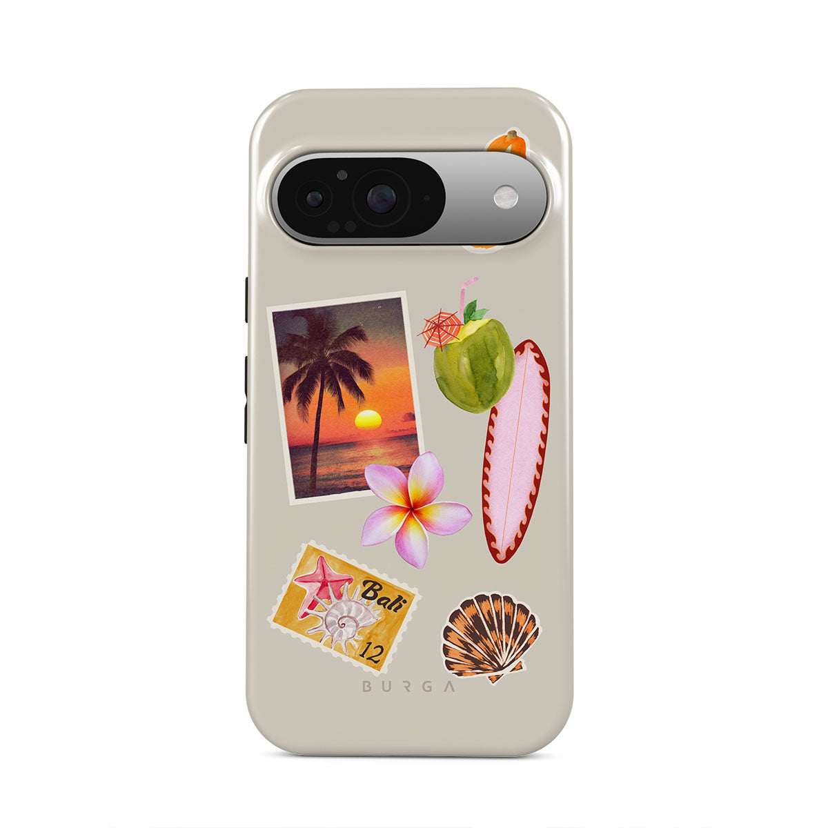 Kenmerken van dit design: tropische zonsondergangsfoto, papaja, groene kokosnoot, roze surfplank, roze plumeria-bloem, oranje schelp, Bali-ansichtkaart.