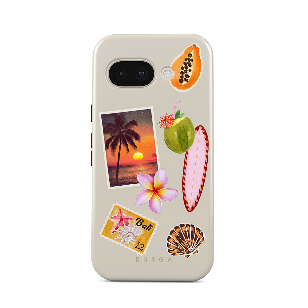 Kenmerken van dit design: tropische zonsondergangsfoto, papaja, groene kokosnoot, roze surfplank, roze plumeria-bloem, oranje schelp, Bali-ansichtkaart.