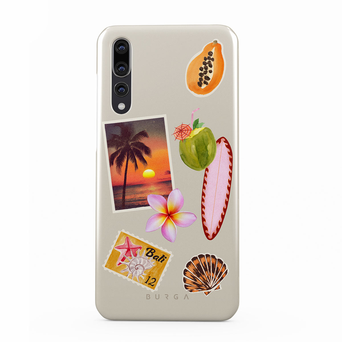 Kenmerken van dit design: tropische zonsondergangsfoto, papaja, groene kokosnoot, roze surfplank, roze plumeria-bloem, oranje schelp, Bali-ansichtkaart.