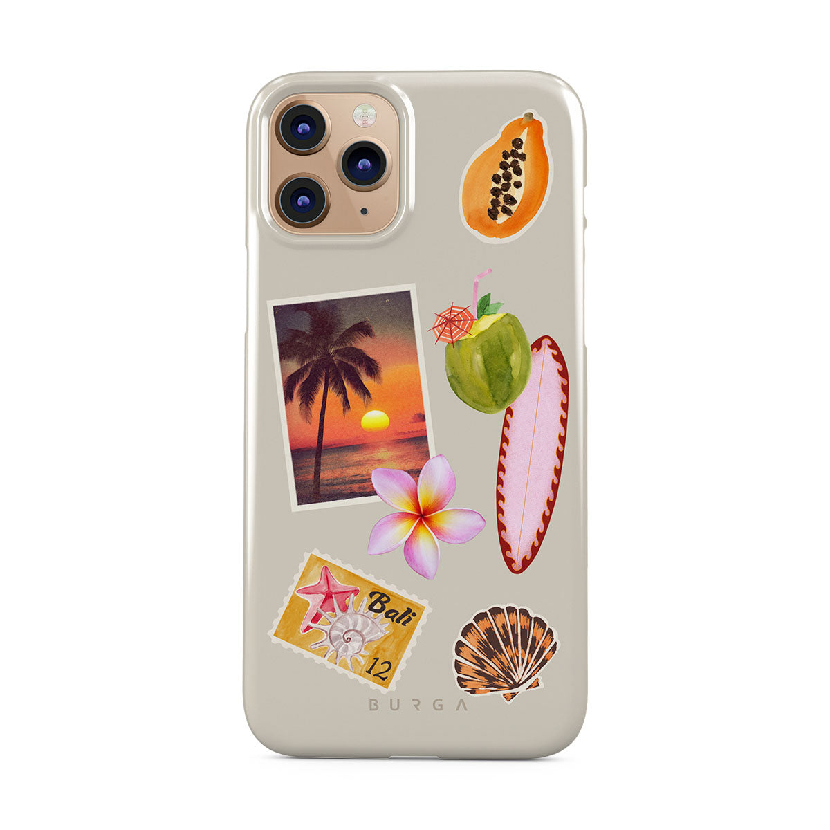 Kenmerken van dit design: tropische zonsondergangsfoto, papaja, groene kokosnoot, roze surfplank, roze plumeria-bloem, oranje schelp, Bali-ansichtkaart.