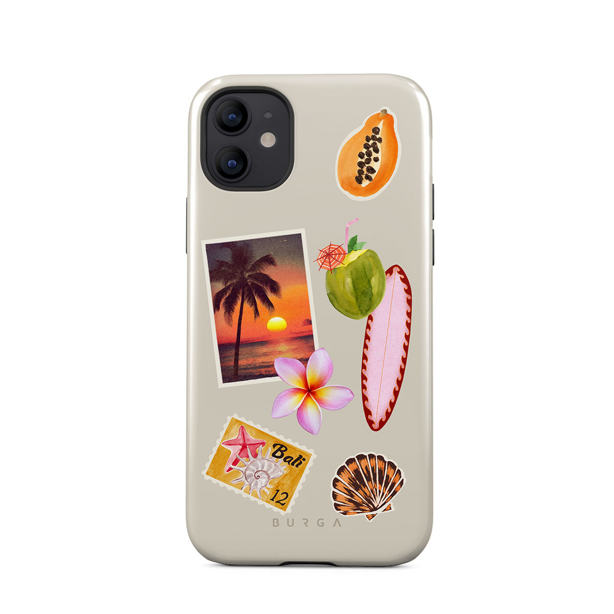 Kenmerken van dit design: tropische zonsondergangsfoto, papaja, groene kokosnoot, roze surfplank, roze plumeria-bloem, oranje schelp, Bali-ansichtkaart.