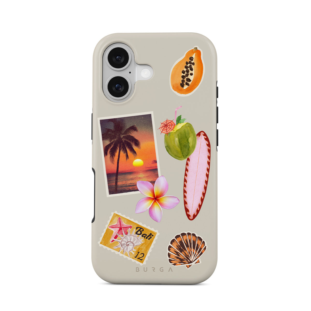 Kenmerken van dit design: tropische zonsondergangsfoto, papaja, groene kokosnoot, roze surfplank, roze plumeria-bloem, oranje schelp, Bali-ansichtkaart.