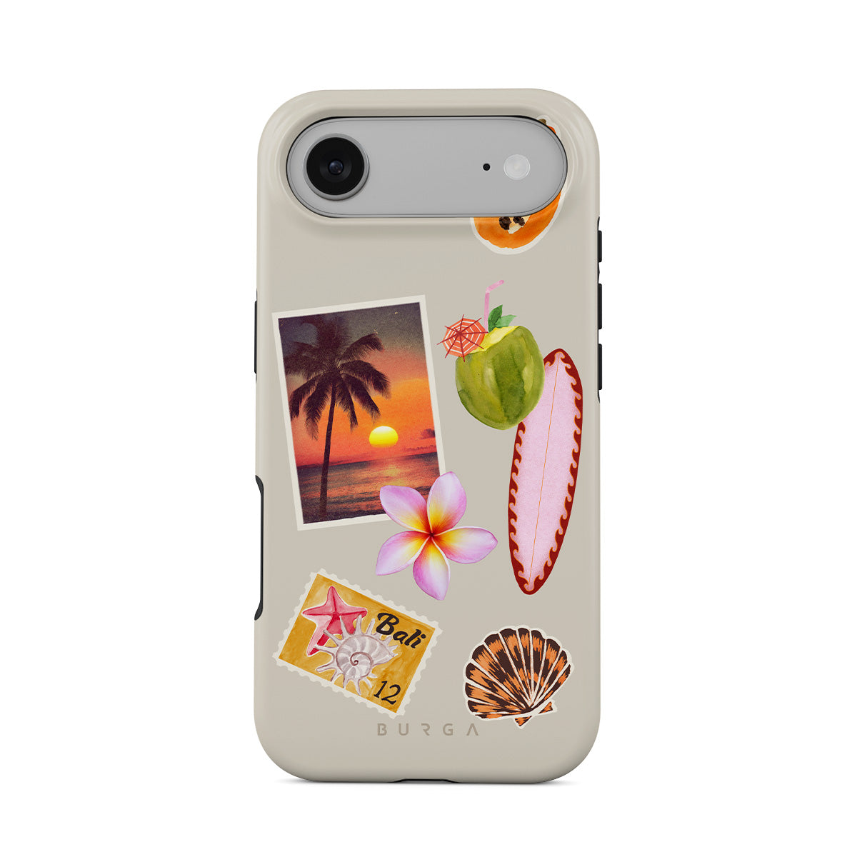 Kenmerken van dit design: tropische zonsondergangsfoto, papaja, groene kokosnoot, roze surfplank, roze plumeria-bloem, oranje schelp, Bali-ansichtkaart.