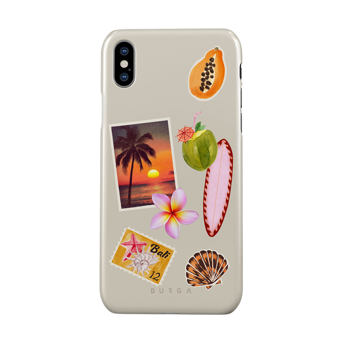 Kenmerken van dit design: tropische zonsondergangsfoto, papaja, groene kokosnoot, roze surfplank, roze plumeria-bloem, oranje schelp, Bali-ansichtkaart.