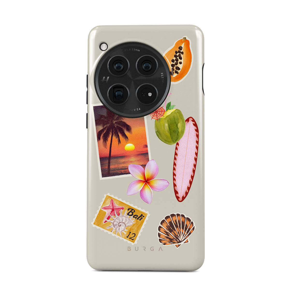 Kenmerken van dit design: tropische zonsondergangsfoto, papaja, groene kokosnoot, roze surfplank, roze plumeria-bloem, oranje schelp, Bali-ansichtkaart.