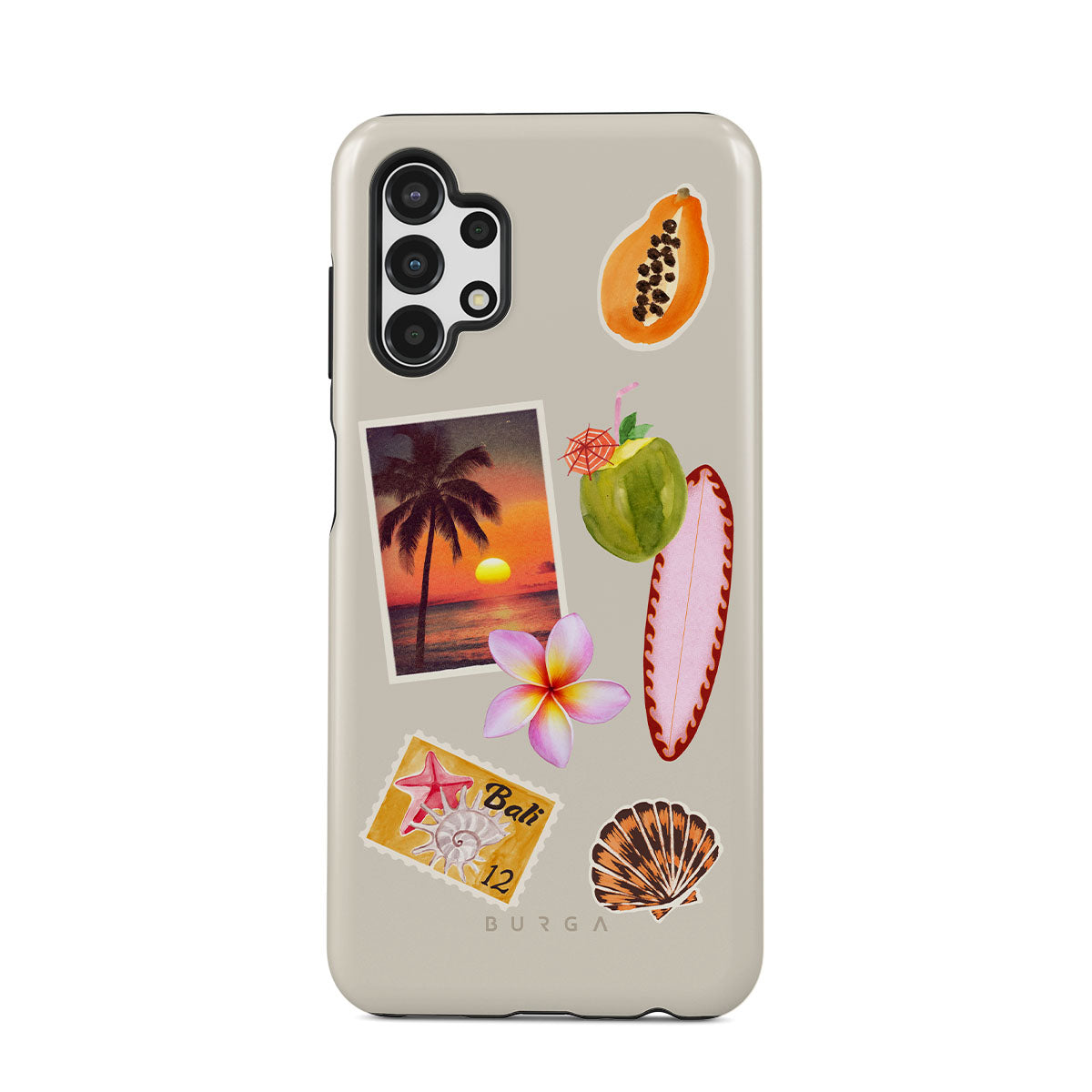 Kenmerken van dit design: tropische zonsondergangsfoto, papaja, groene kokosnoot, roze surfplank, roze plumeria-bloem, oranje schelp, Bali-ansichtkaart.