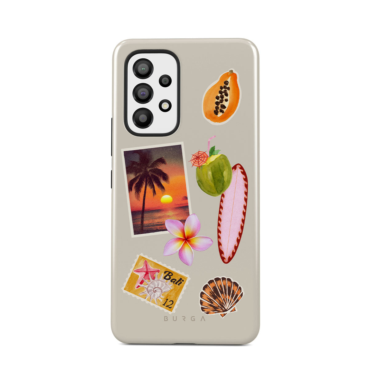 Kenmerken van dit design: tropische zonsondergangsfoto, papaja, groene kokosnoot, roze surfplank, roze plumeria-bloem, oranje schelp, Bali-ansichtkaart.