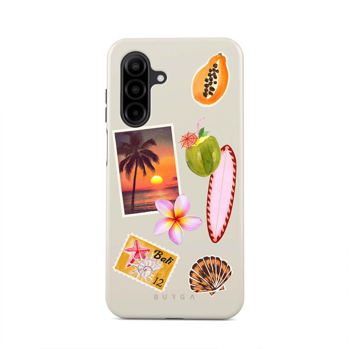 Kenmerken van dit design: tropische zonsondergangsfoto, papaja, groene kokosnoot, roze surfplank, roze plumeria-bloem, oranje schelp, Bali-ansichtkaart.