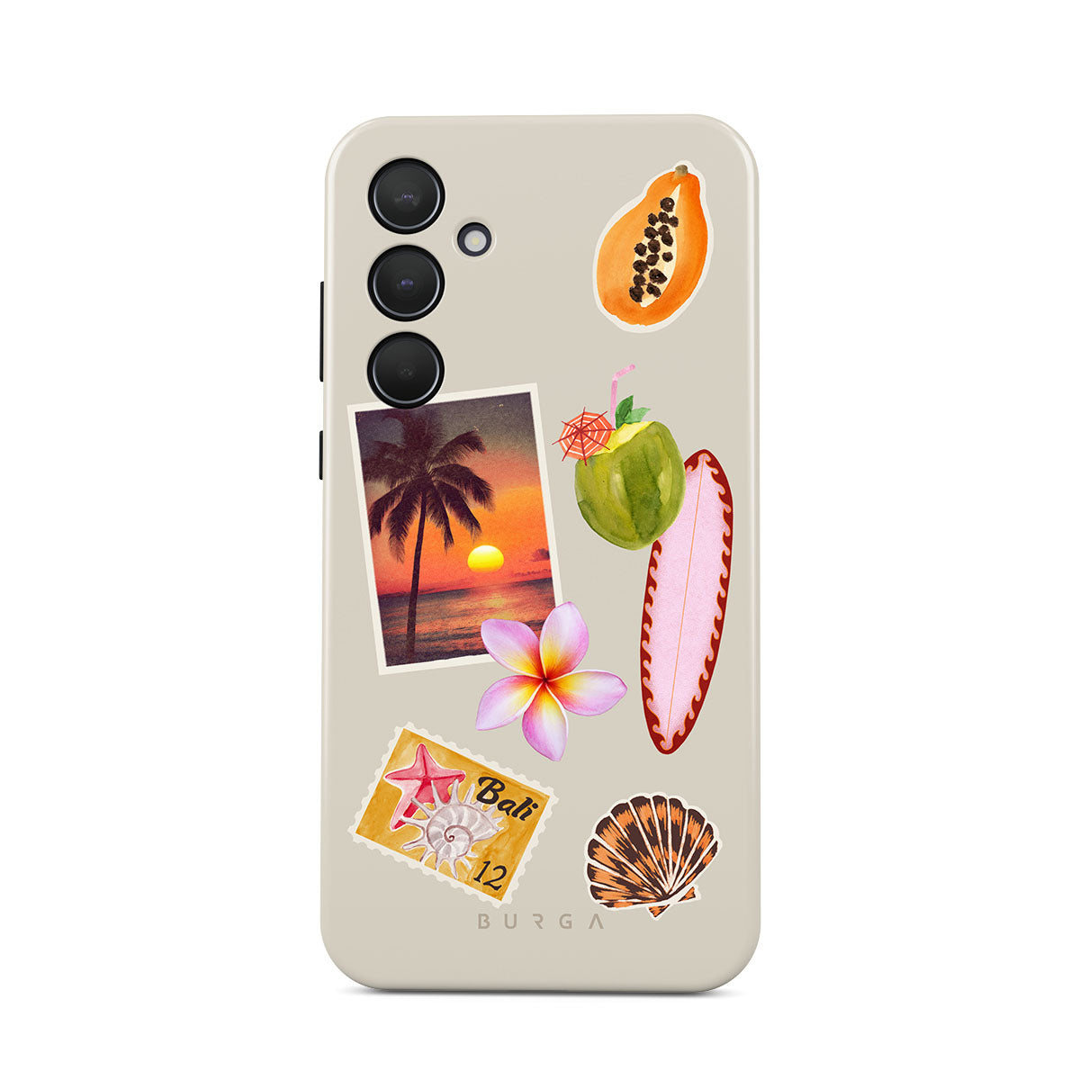 Kenmerken van dit design: tropische zonsondergangsfoto, papaja, groene kokosnoot, roze surfplank, roze plumeria-bloem, oranje schelp, Bali-ansichtkaart.